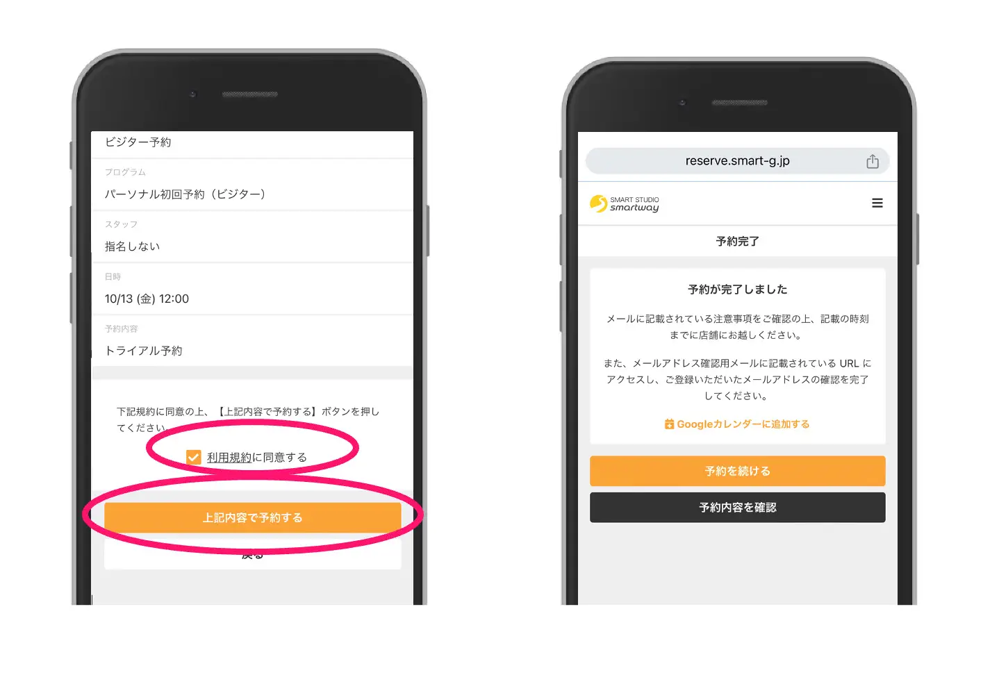 9)「利用規約に同意する」選択し、「上記内容で予約する」を押します。