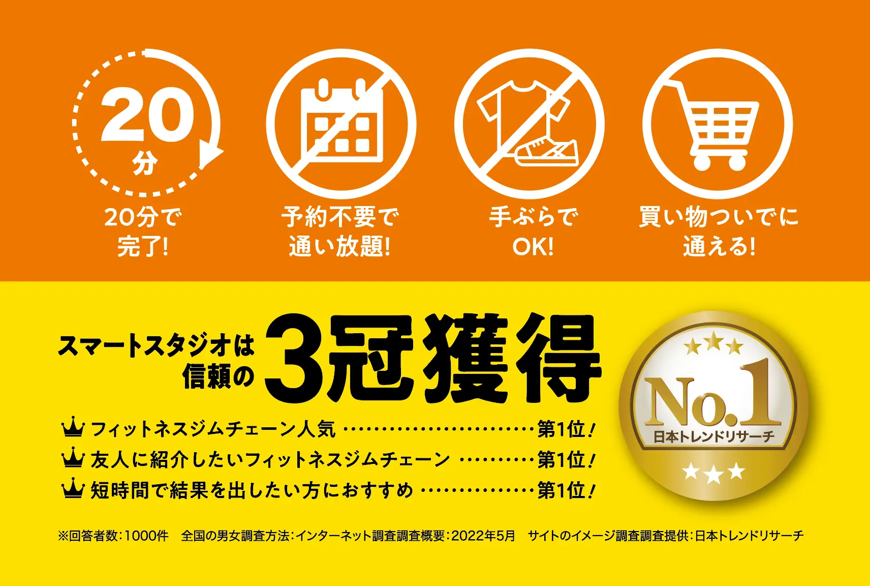 スマートスタジオは、駐車場が広々のショッピングセンターや大型ドラッグストアにあり、買い物ついでに通うことができます。運動靴もトレーニングウェアもいらないため、手ぶらで、気軽に、スキマ時間に通うことができます。スタッフが多数在籍しているので安心して通えます。
